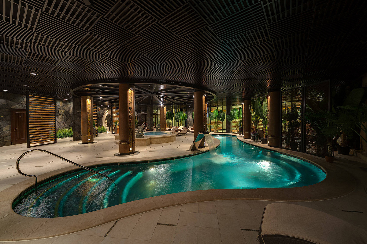 Релакс-бассейн с большой зоной отдыха, выполненной в марокканском стиле, привлекает возможностью остаться наедине с самим собой, поплавать в тишине и насладиться встроенными водными аттракционами.